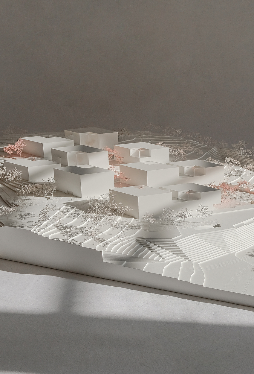 The new Institute of Digital Sciences Austria* is located on a hill on the edge of the Linz basin to the north-east of the city of Linz. The urban design envisages an open construction in the form of diamond-shaped linked block buildings that are anchored in the cityscape as a “green campus” and consciously open up to the adjacent urban space. The ensemble reflects the topography of the site and integrates harmoniously into the landscape. In keeping with the principle of climate-sensitive architecture, the individual buildings are arranged as stringent bands in a linear grid parallel to the wind direction, allowing the downdraught essential for the natural ventilation of the city to flow unhindered.